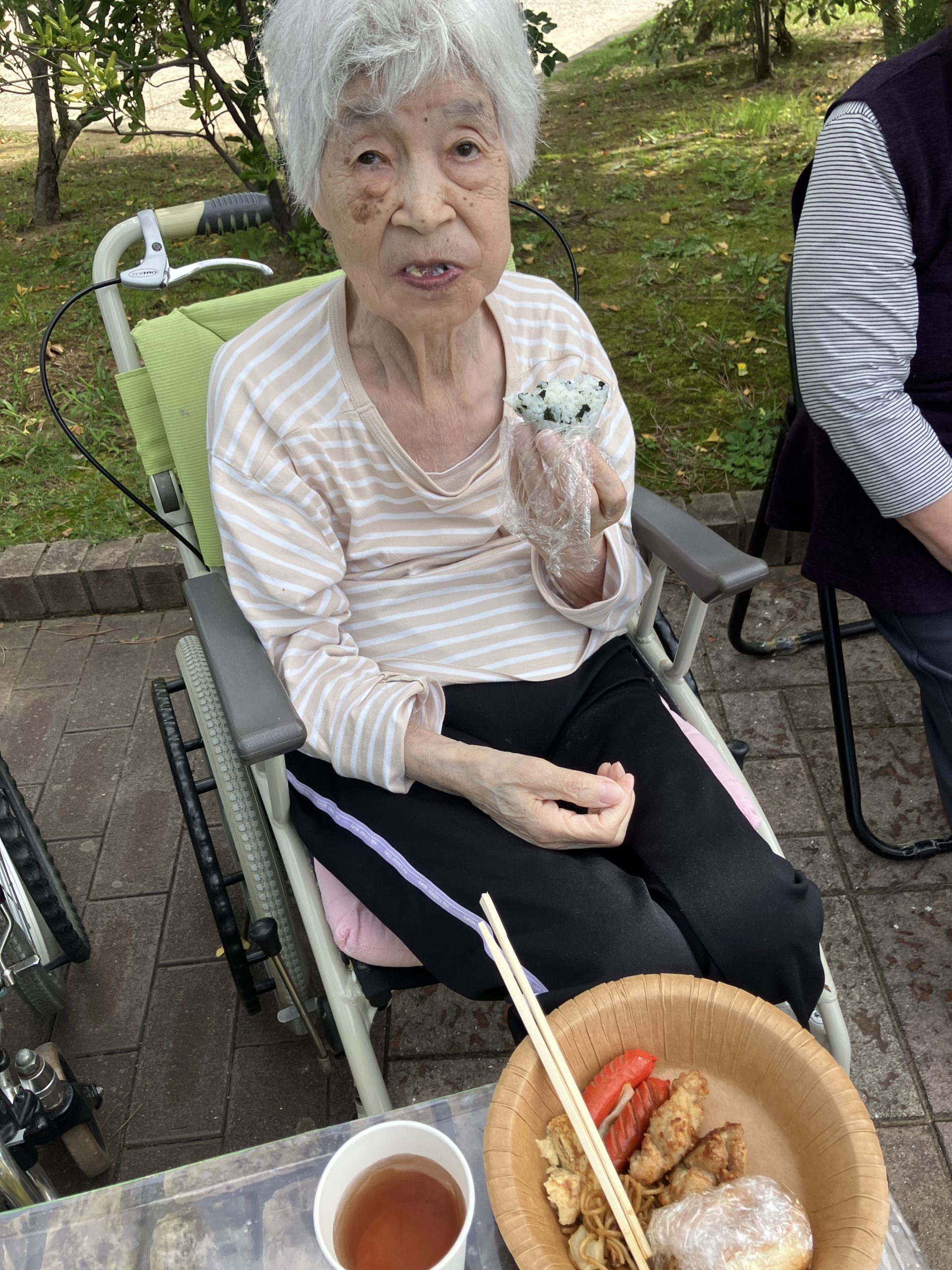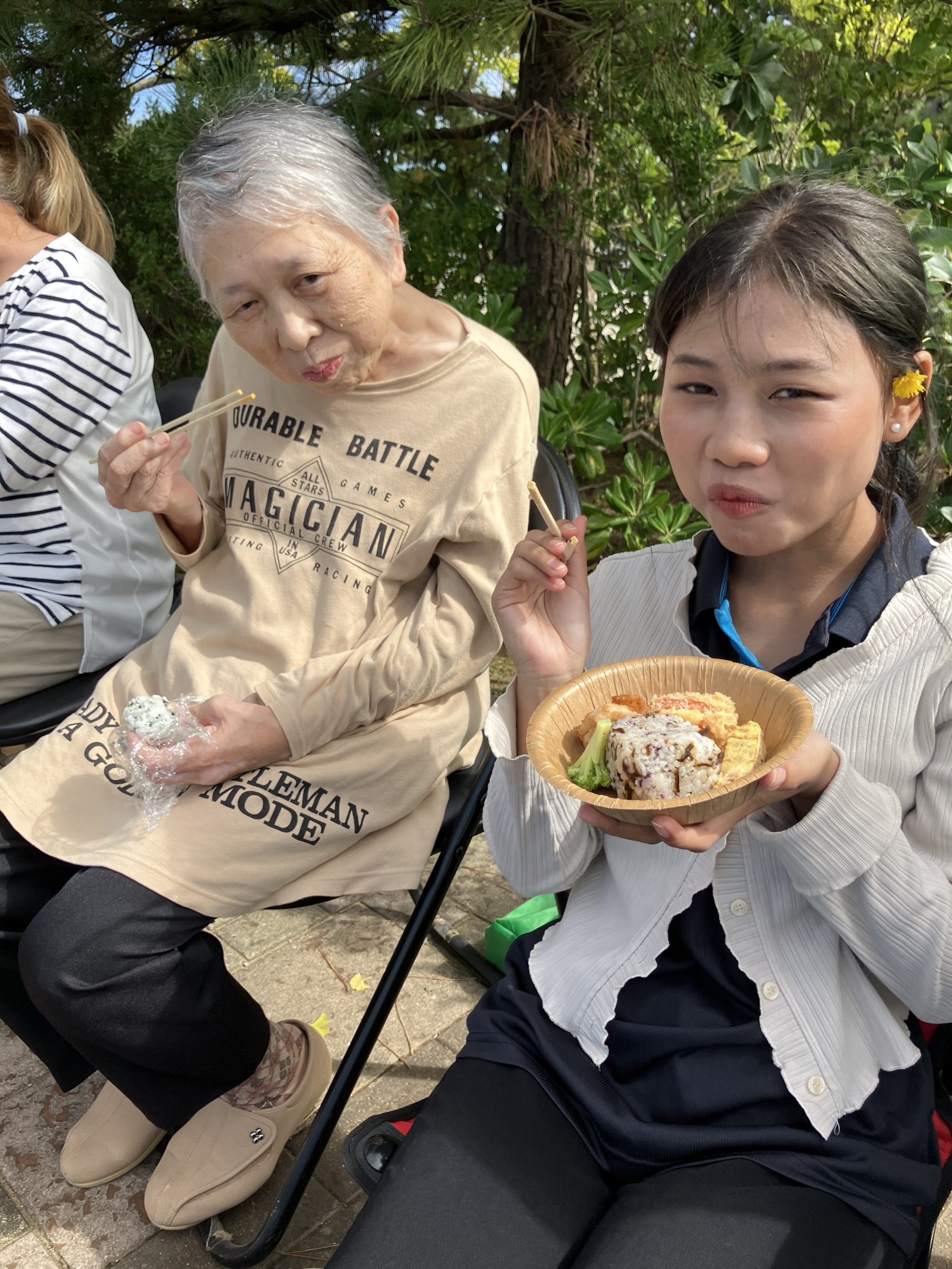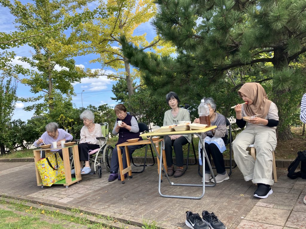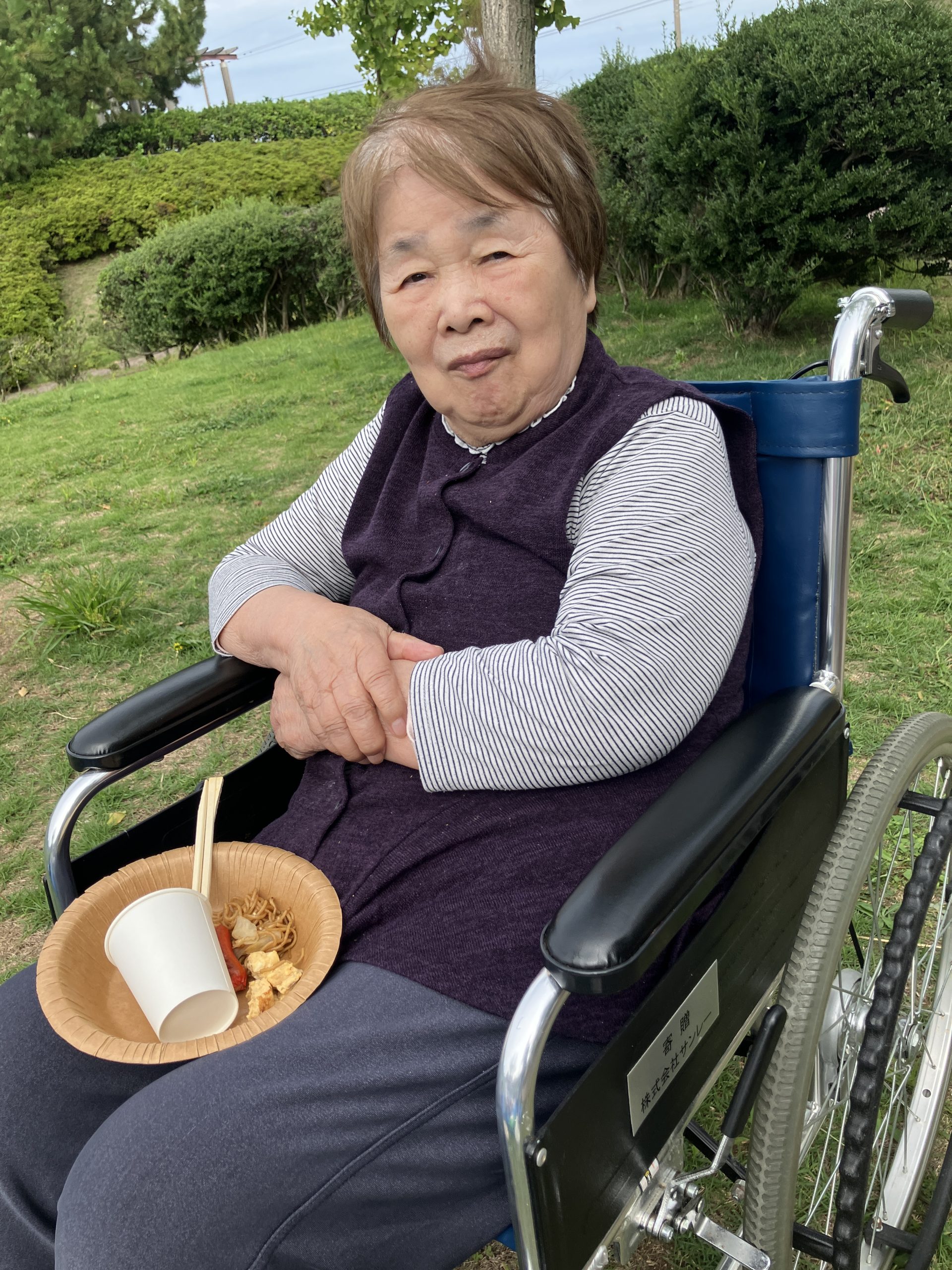 ピクニックに行きました。 秋晴れに恵まれた10月10日。お弁当を作り、三階全員で大野お台場公園へピクニックに行きました。 音楽を流しながら雰囲気つくり。お日様の光を浴び風を感じ「あ~いい気持ち」との声が自然と聞かれました。 食欲もりもり!いつも以上に召し上がり、シャボン玉やバトミントンに歓声が上がりました。 ちょっぴり日焼けしましたが、久しぶりの外出楽しんでいただけたでしょうか?