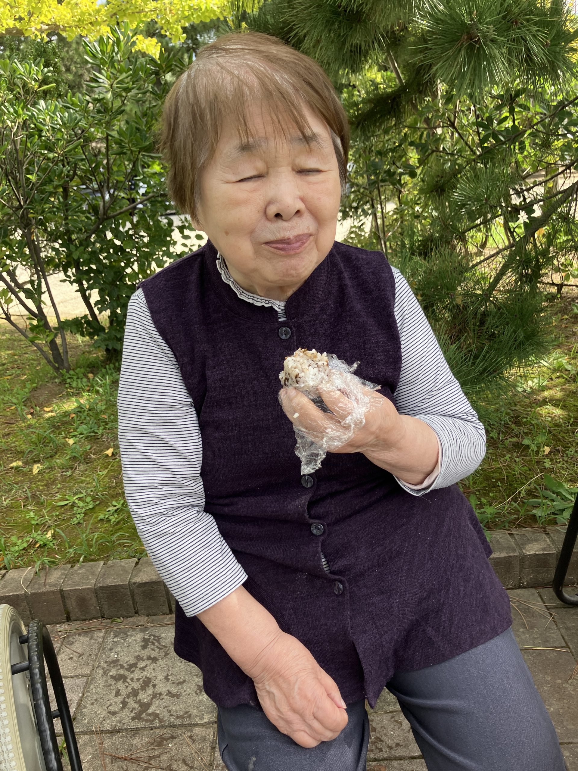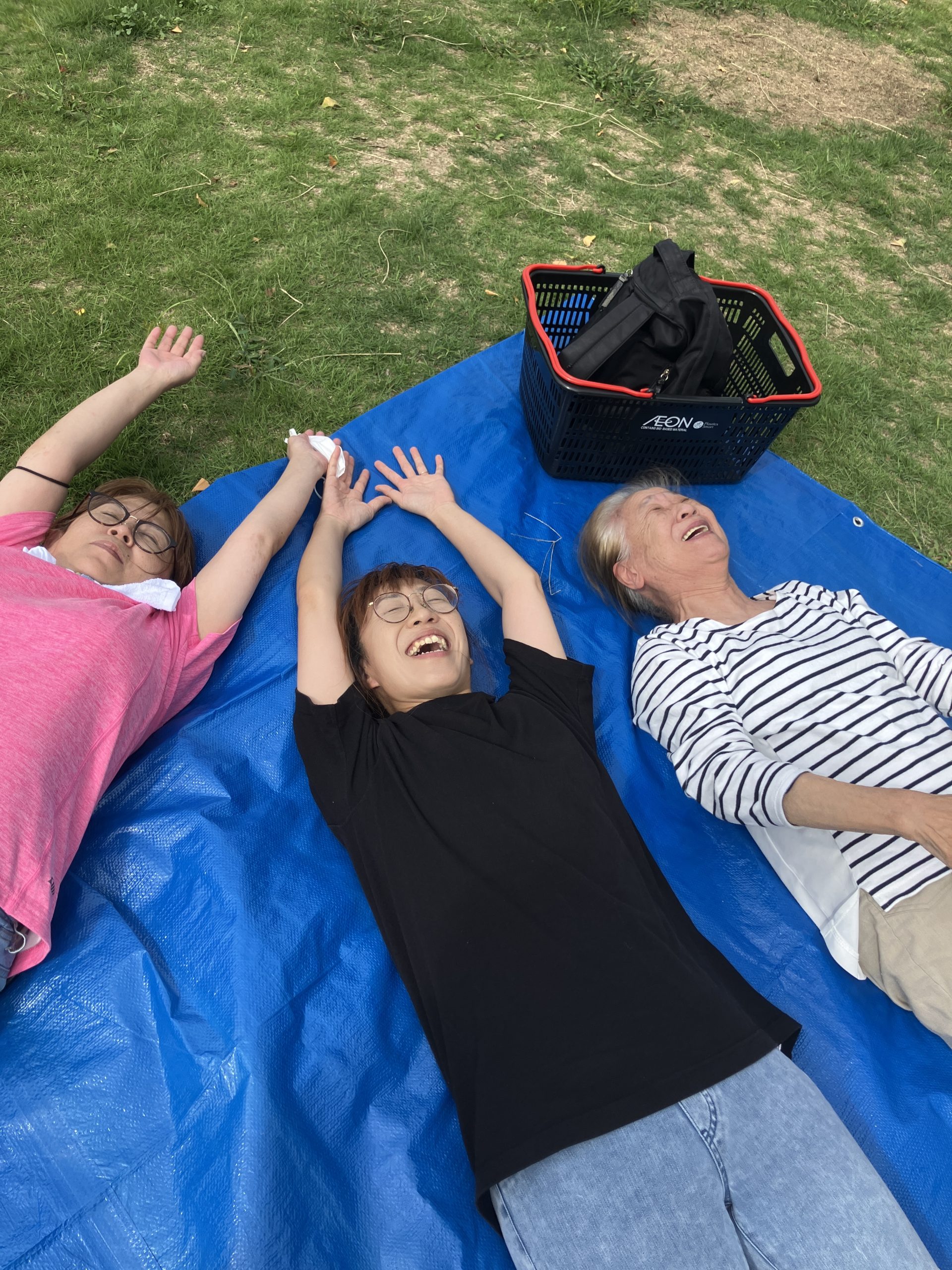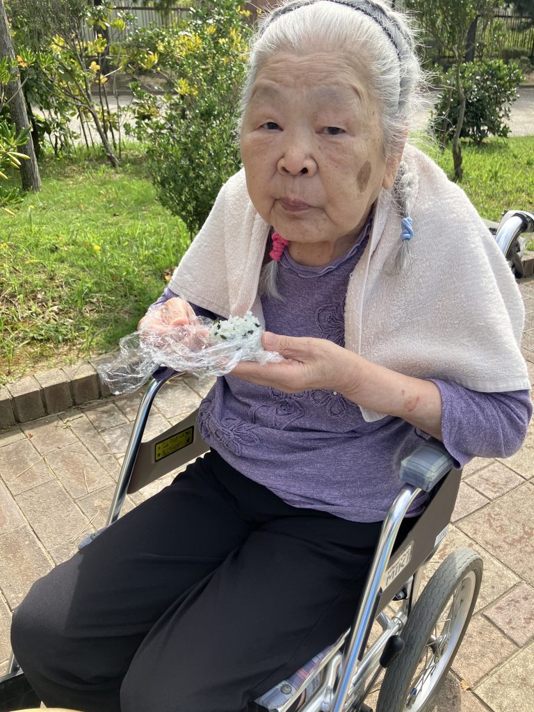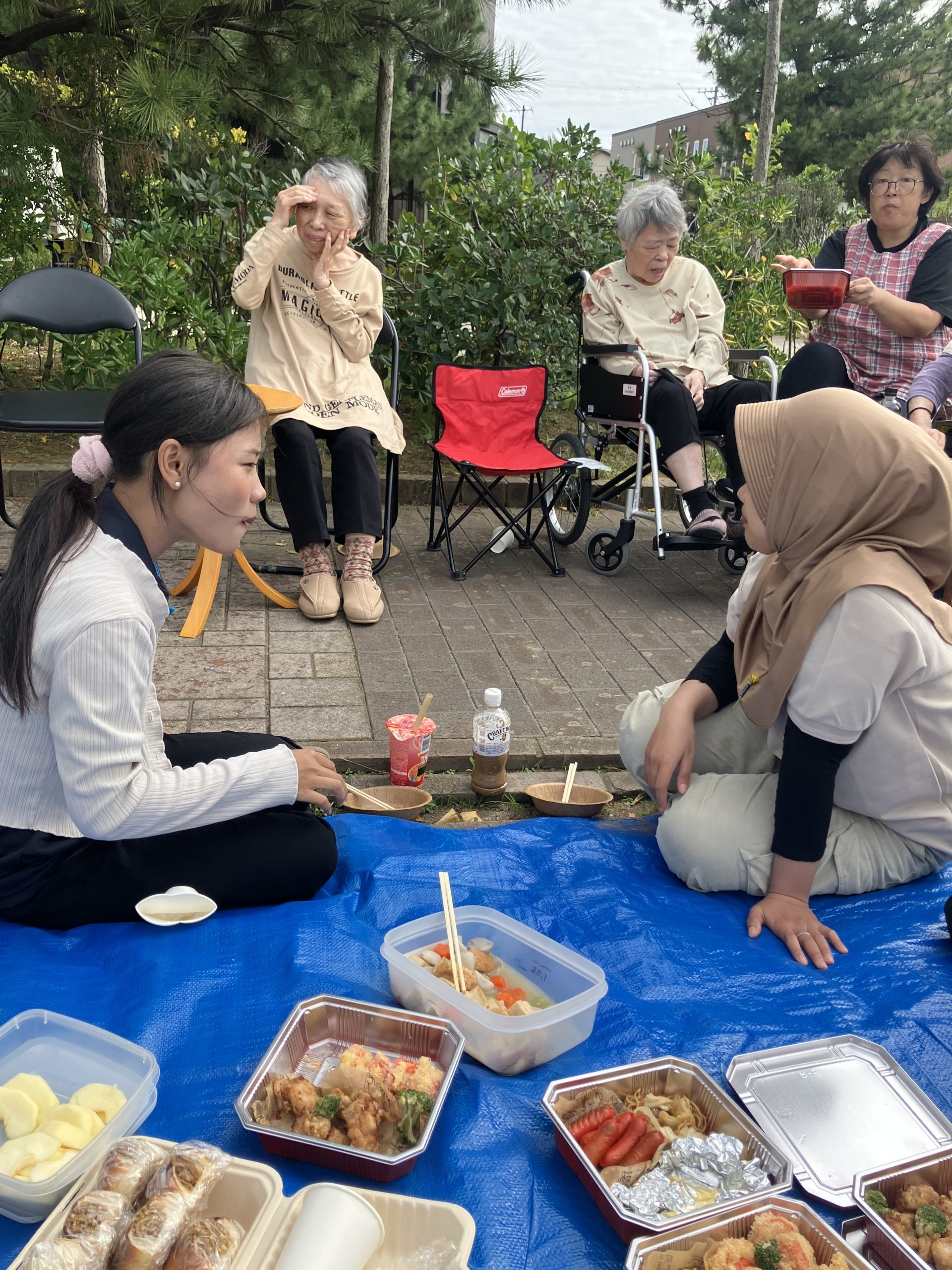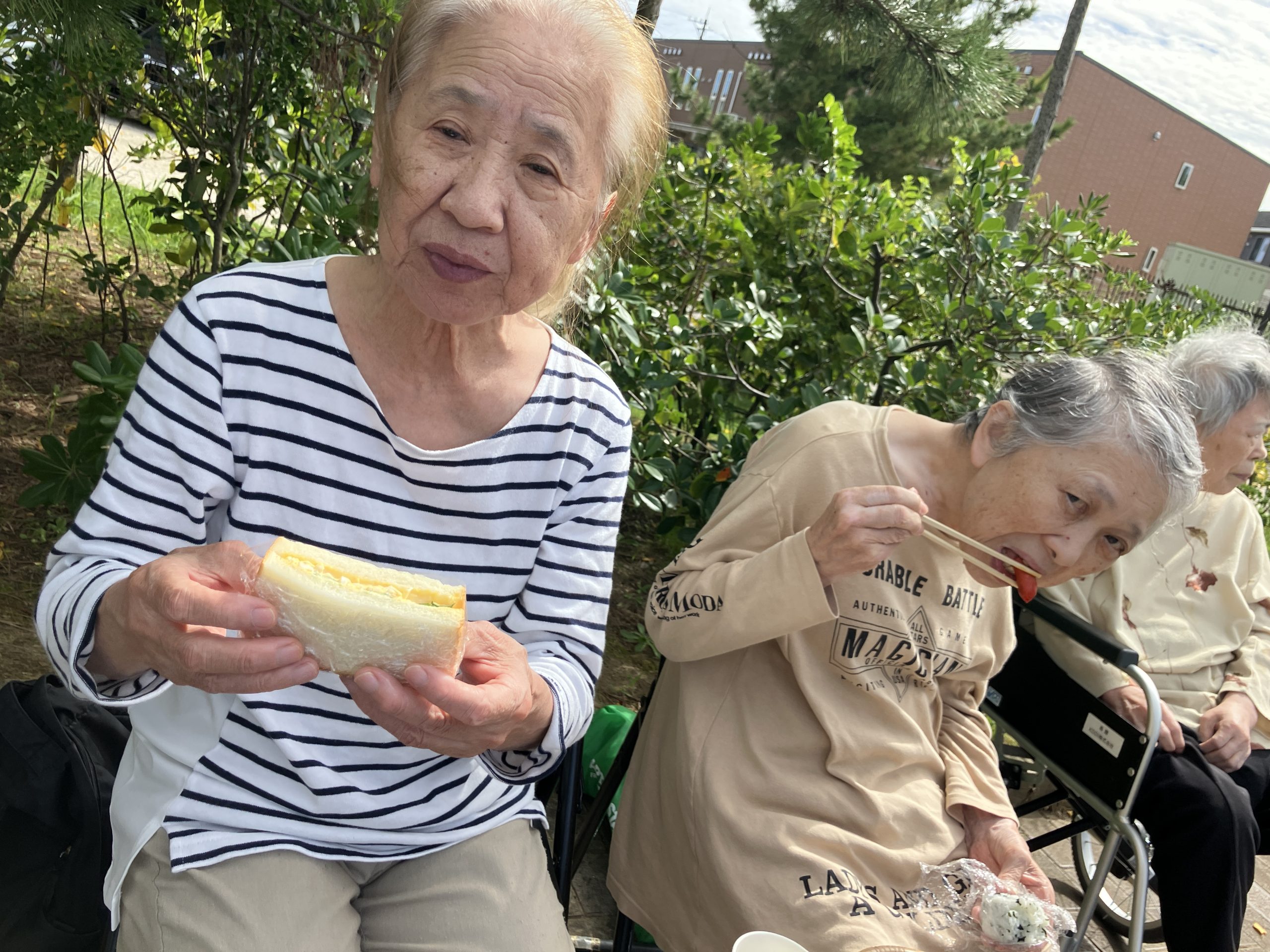 ピクニックに行きました。 秋晴れに恵まれた10月10日。お弁当を作り、三階全員で大野お台場公園へピクニックに行きました。 音楽を流しながら雰囲気つくり。お日様の光を浴び風を感じ「あ~いい気持ち」との声が自然と聞かれました。 食欲もりもり!いつも以上に召し上がり、シャボン玉やバトミントンに歓声が上がりました。 ちょっぴり日焼けしましたが、久しぶりの外出楽しんでいただけたでしょうか?