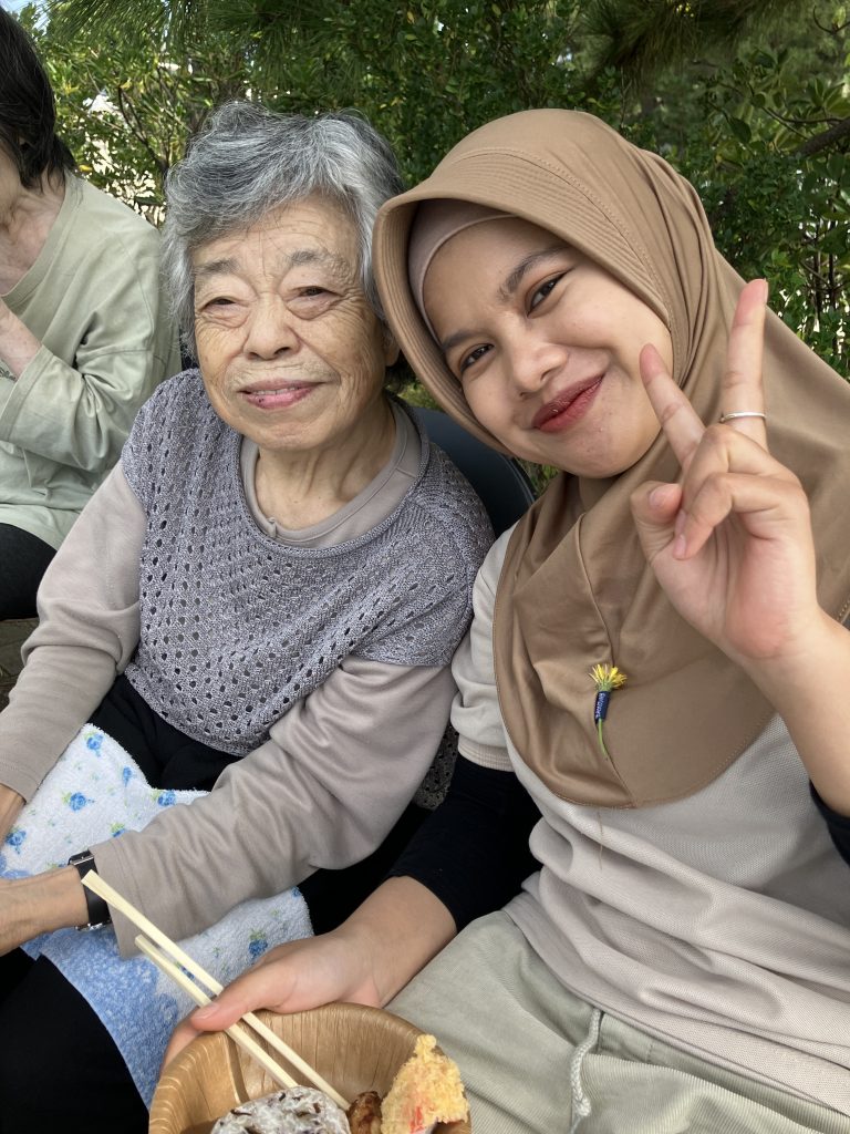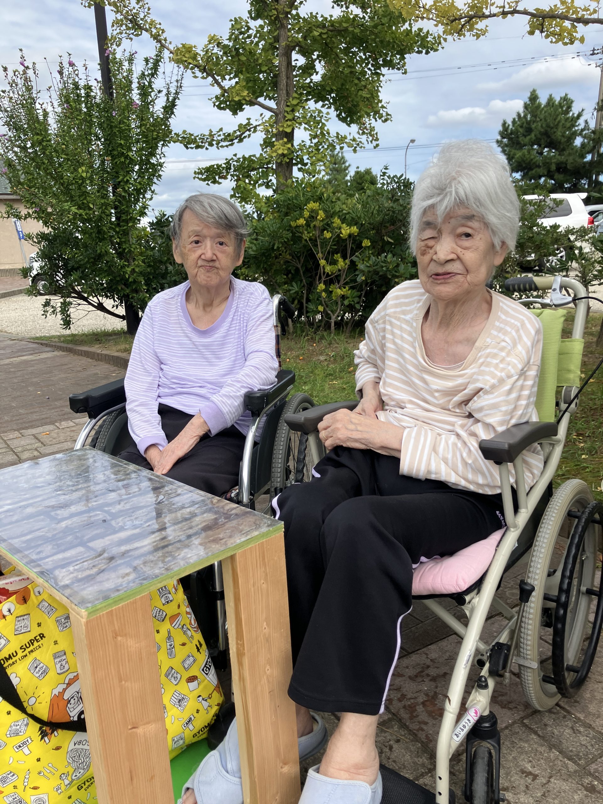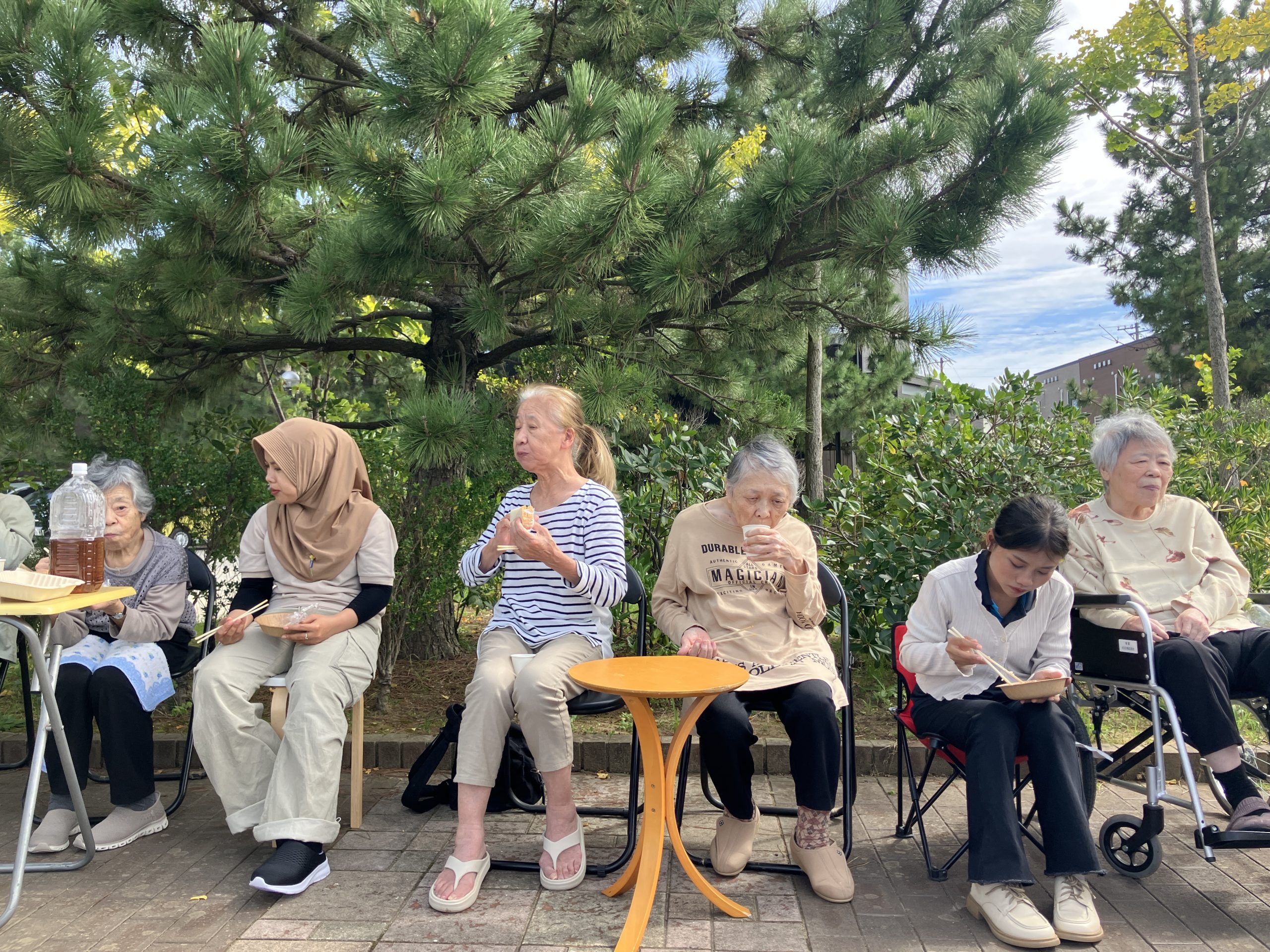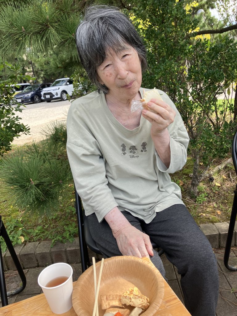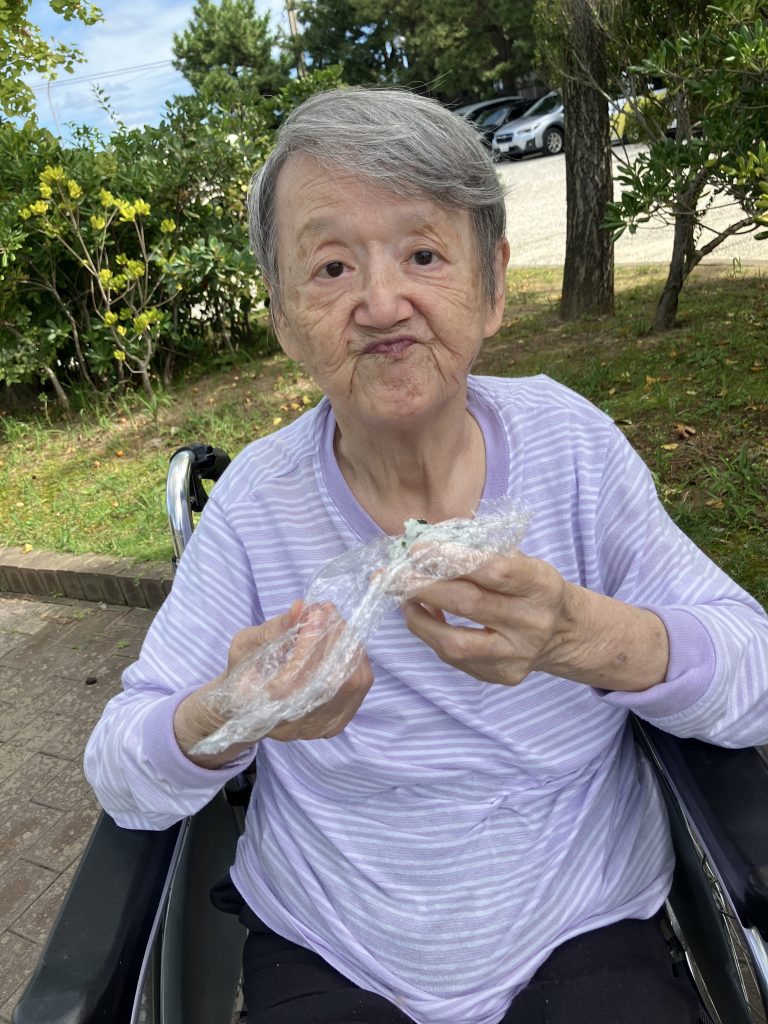 ピクニックに行きました。 秋晴れに恵まれた10月10日。お弁当を作り、三階全員で大野お台場公園へピクニックに行きました。 音楽を流しながら雰囲気つくり。お日様の光を浴び風を感じ「あ~いい気持ち」との声が自然と聞かれました。 食欲もりもり!いつも以上に召し上がり、シャボン玉やバトミントンに歓声が上がりました。 ちょっぴり日焼けしましたが、久しぶりの外出楽しんでいただけたでしょうか?