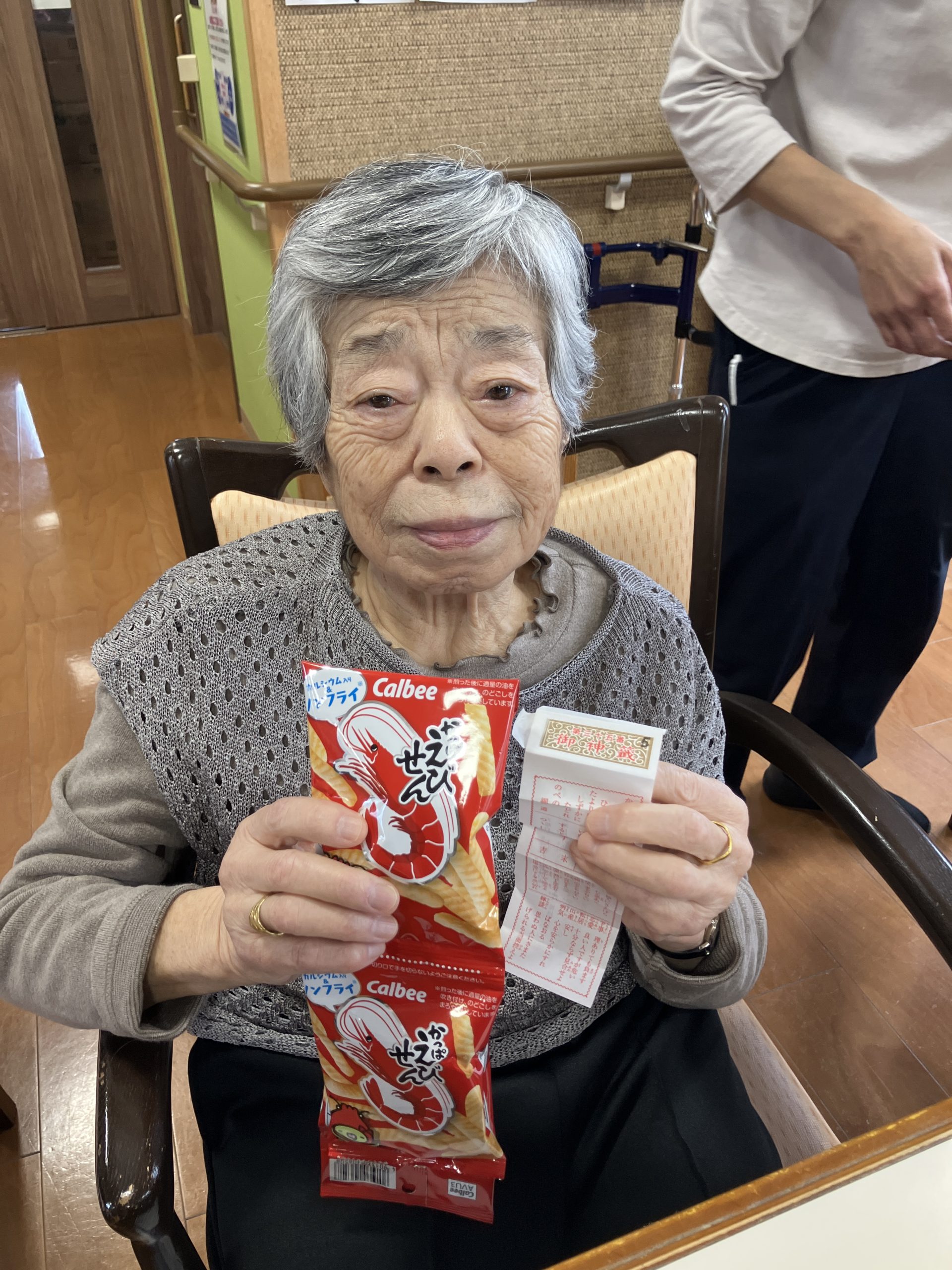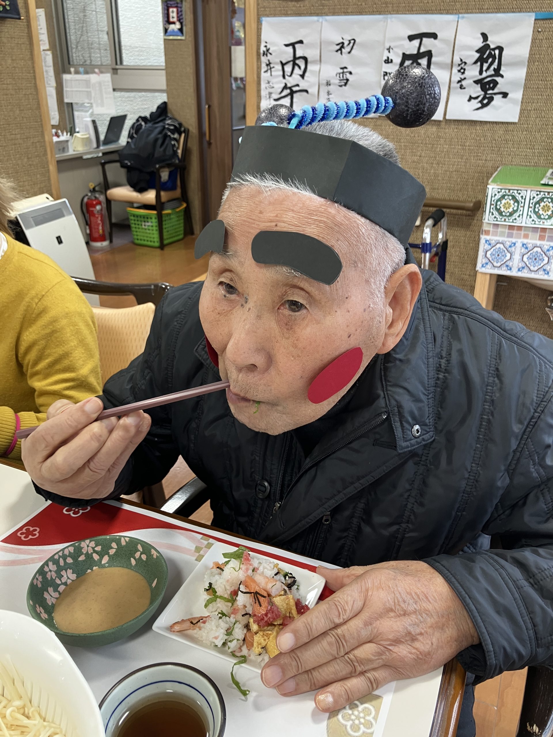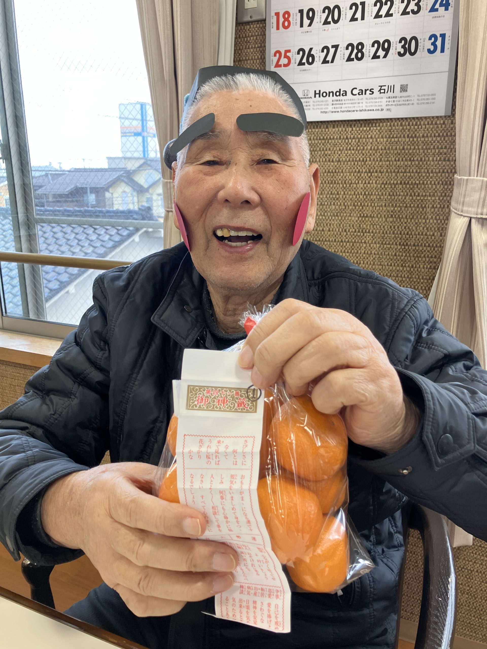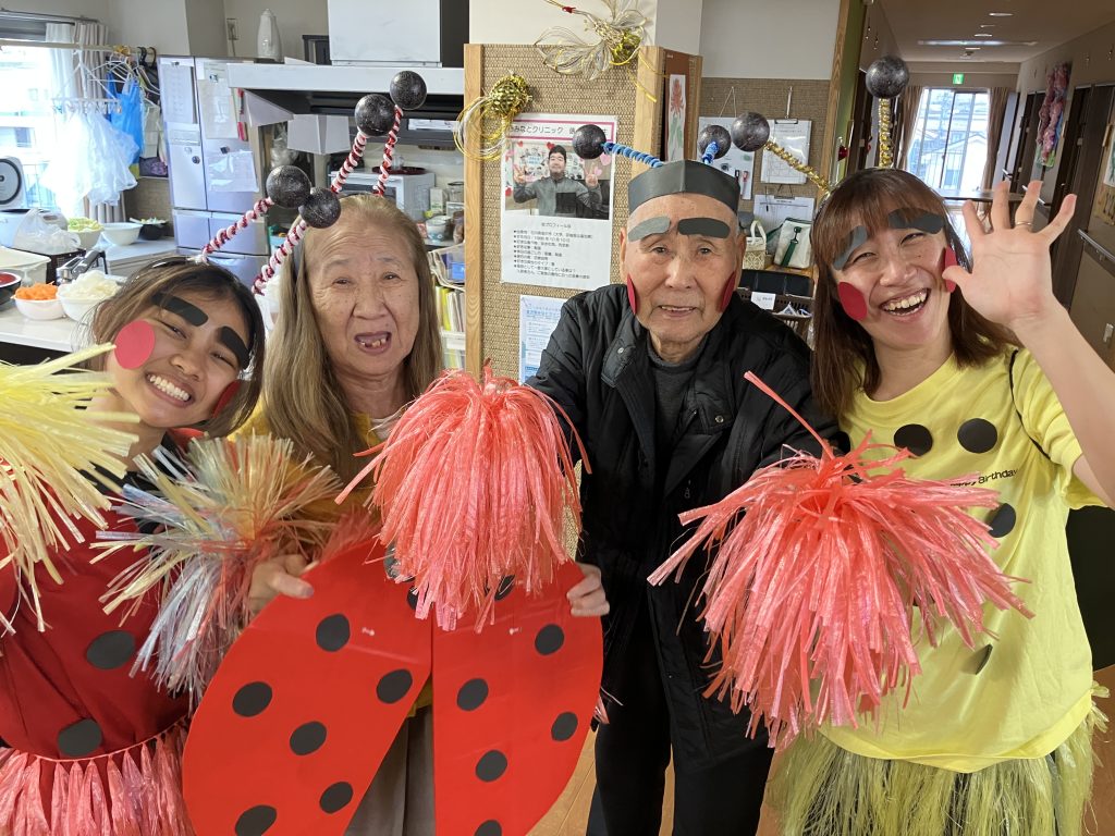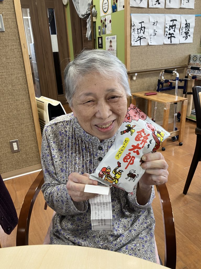 新年会 今年は、丙午!新年会をしました。職員の踊りを披露し皆様からのたくさんの声援をいただきまま。一緒にポンポンを振って応援し、盛り上げていただきました。 かるたや羽根つき、トランプ。グループに分かれて楽しみました。 おみくじには、番号が書かれており、ミカンやおかしなどの景品もついており、大変喜んでいただきました。 メインメニューは、皆様待望の「ブリしゃぶ」箸が止まりません。私たちが思った以上に喜んでいただきました。 本年も、楽しいイベントう提供できるよう職員一同頑張ります。よろしくお願い致します。