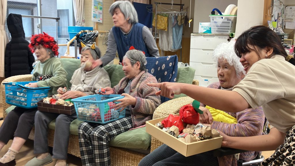 2025年12月29日 クリスマス会 ゲームに、ランチ、職員によるダンス、手作りケーキと楽しい1日になりました。 床にテープで作ったクリスマスツリーの中におじゃみを投げ入れ、得点を競うゲーム。 ランチでは、チキン、サラダ、サンドイッチと美味しく頂きました。 ダンスでは、職員全員でダンシングヒーローを踊り、ケーキをおやつに食べてます。 ……