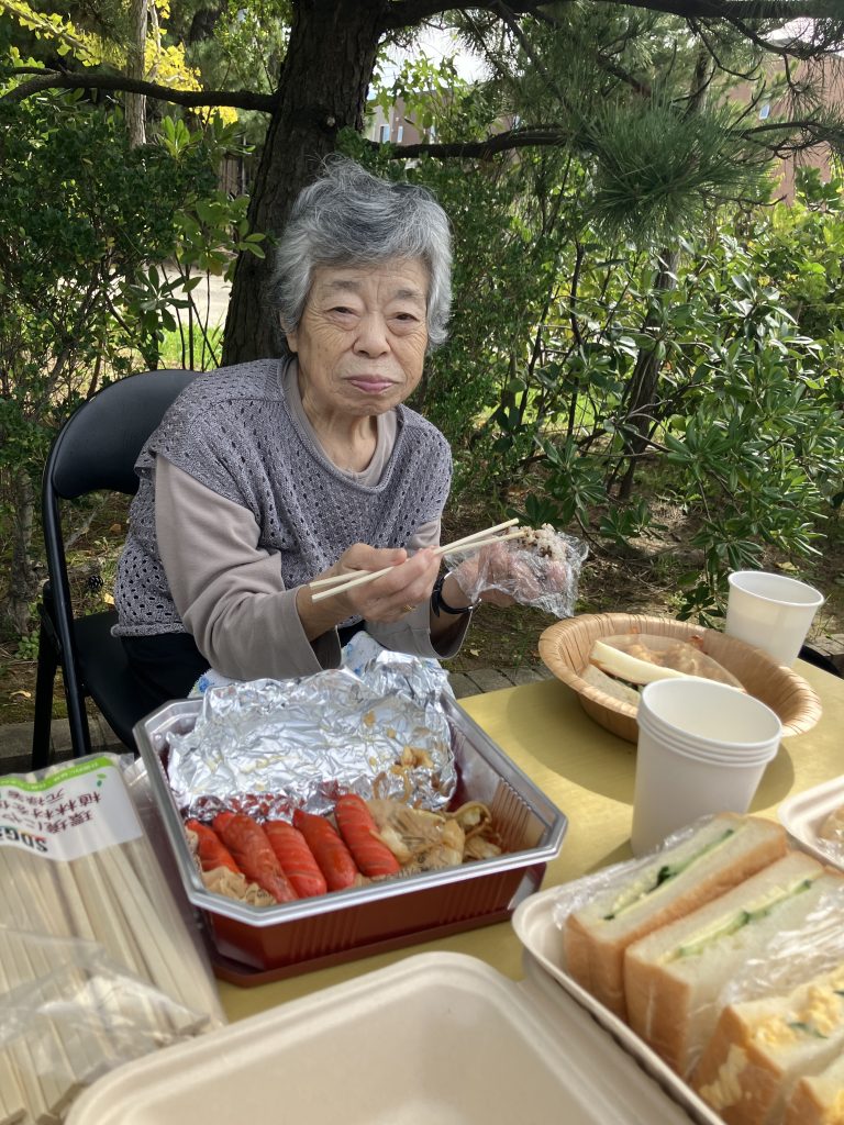 2025年10月31日 ピクニックに行きました。 秋晴れに恵まれた10月10日。お弁当を作り、三階全員で大野お台場公園へピクニックに行きました。 音楽を流しながら雰囲気つくり。お日様の光を浴び風を感じ「あ~いい気持ち」との声が自然と聞かれました。 食欲もりもり!いつも以上に召し上がり、シャボン玉やバトミントンに歓声が上がりました。 ちょっぴり日焼けしましたが、久しぶりの外出楽しんでいただけたでしょうか? ……